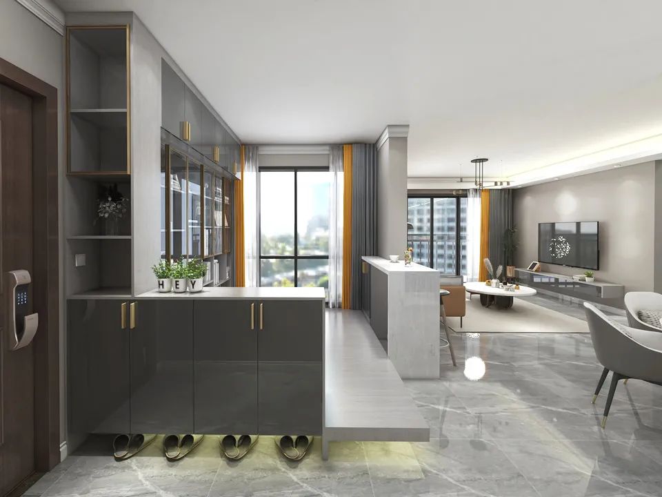 這種情況在小戶型是最常見的,為了避免一覽無余的尷尬感,很多屋主都會選擇設計一個,垂直于墻面的隔斷柜,來進行視線的阻隔,考慮到實用功能,建議全鋁鞋柜可以做通頂設計。