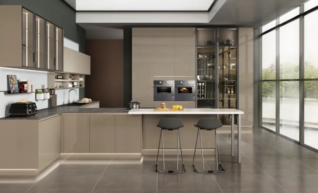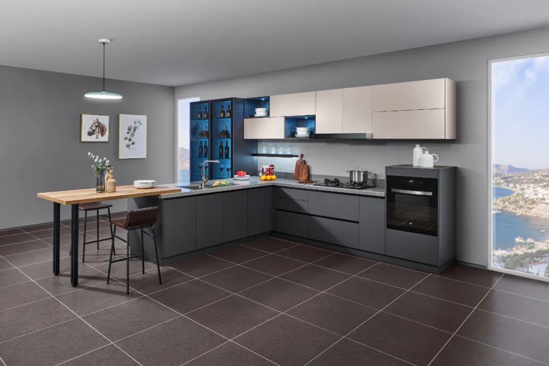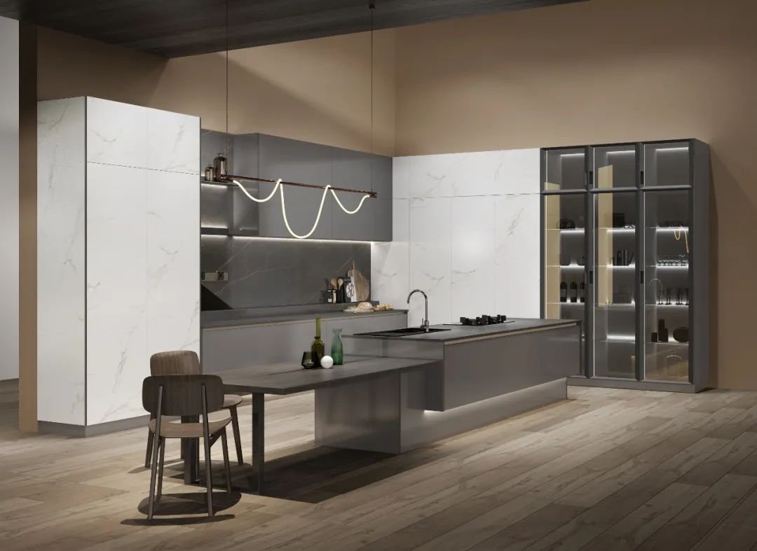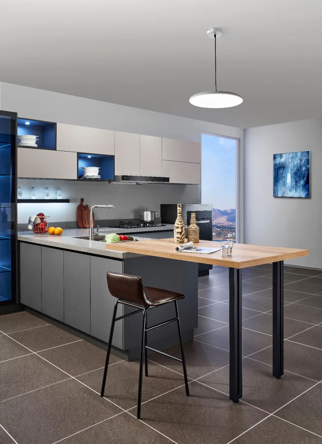 鋁師傅櫥柜,線條利落有致,格局清晰分明,開放式設計可以增強家庭成員間的互動,延展式木質吧臺的嵌入,將自然元素與都市線條和諧過度,中高柜與嵌入式廚電相得益彰,強化空間的收納功能。