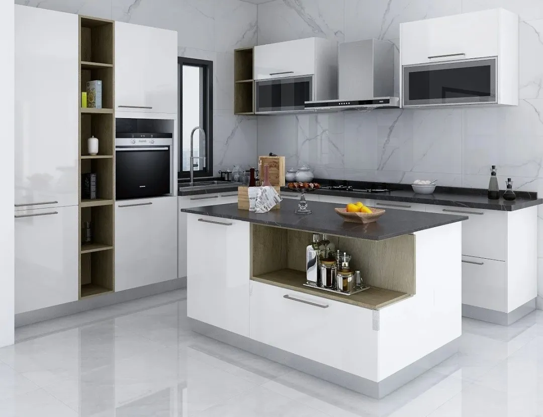 簡約卻富有肌理感的門板設計讓廚房空間無比閃耀。高柜與開放柜的巧妙搭配,極簡大氣 時尚而精致,將廚電嵌入櫥柜柜體,干脆利落,塑造生活的品質感。