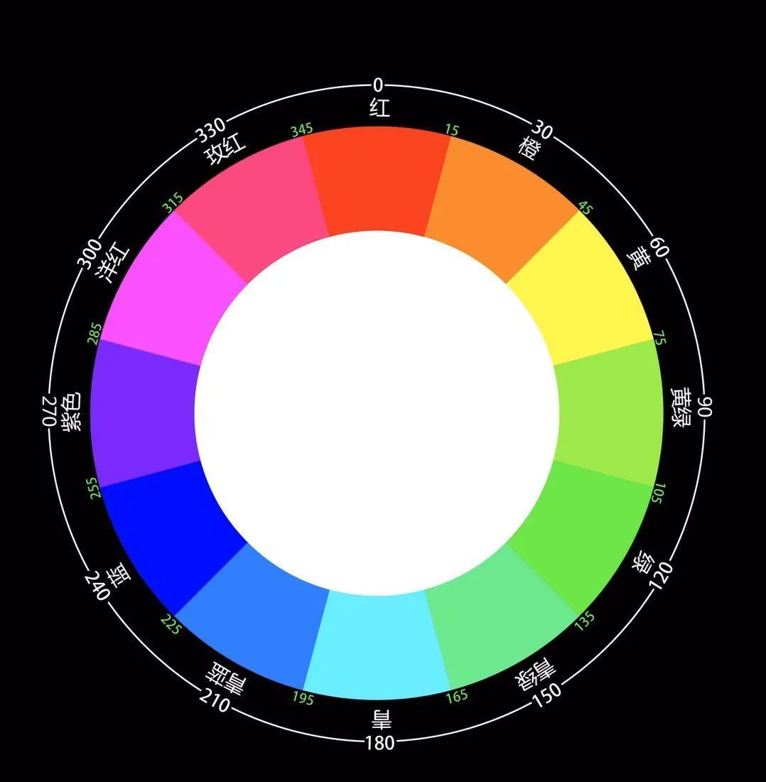 除了黑、白、灰三種無彩色,任何色彩都有色相。設計常用到的色相環就是最直觀的表達。