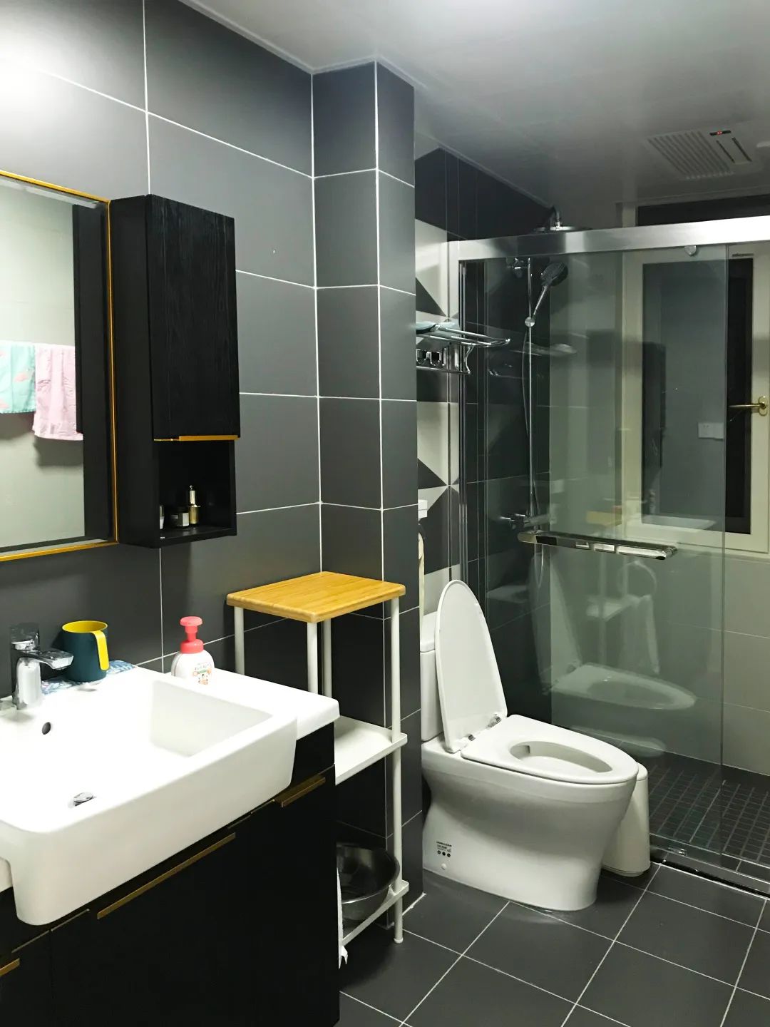 而衛生間的重點就是清潔度,在墻面選色上,建議以清潔感較強的冷色調或黑灰色為佳(特別提醒:不要選白地磚,特顯臟),至于浴室柜、浴缸、浴簾等配置,選擇同類色或鄰近色便可。