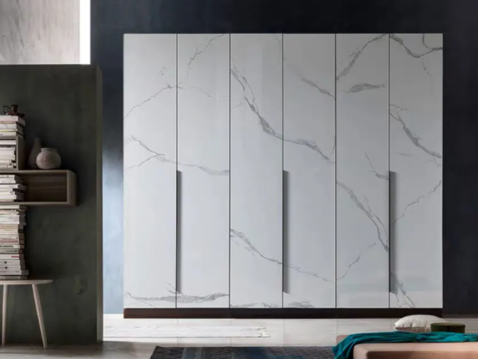 巖板可以應用在定制家居產品的柜門。衣柜的體積都較大,柜門所需的材料也比較大,巖板的大幅面規格非常適合作為衣柜柜門,由于巖板逼真的3D紋理和光滑的質感,輕松的營造出輕奢的風格。